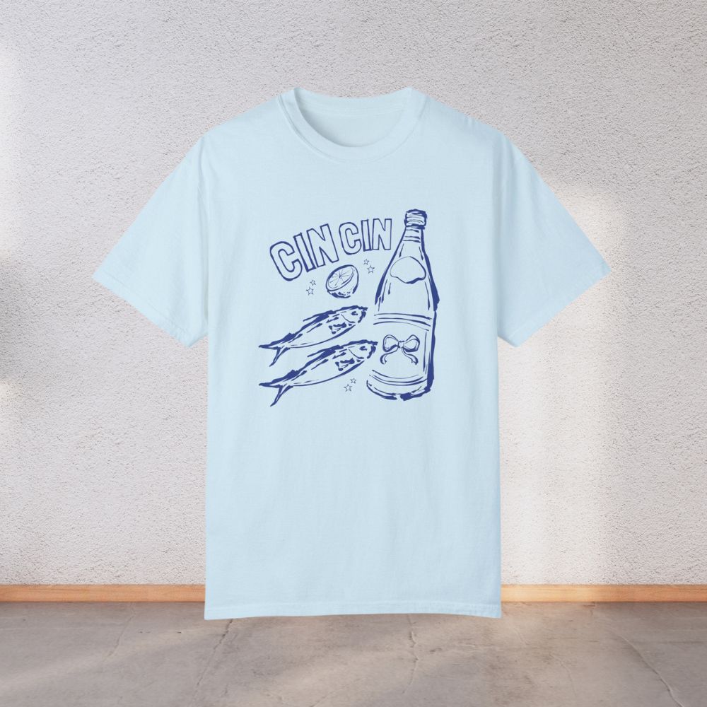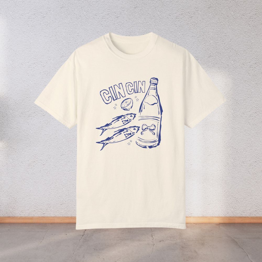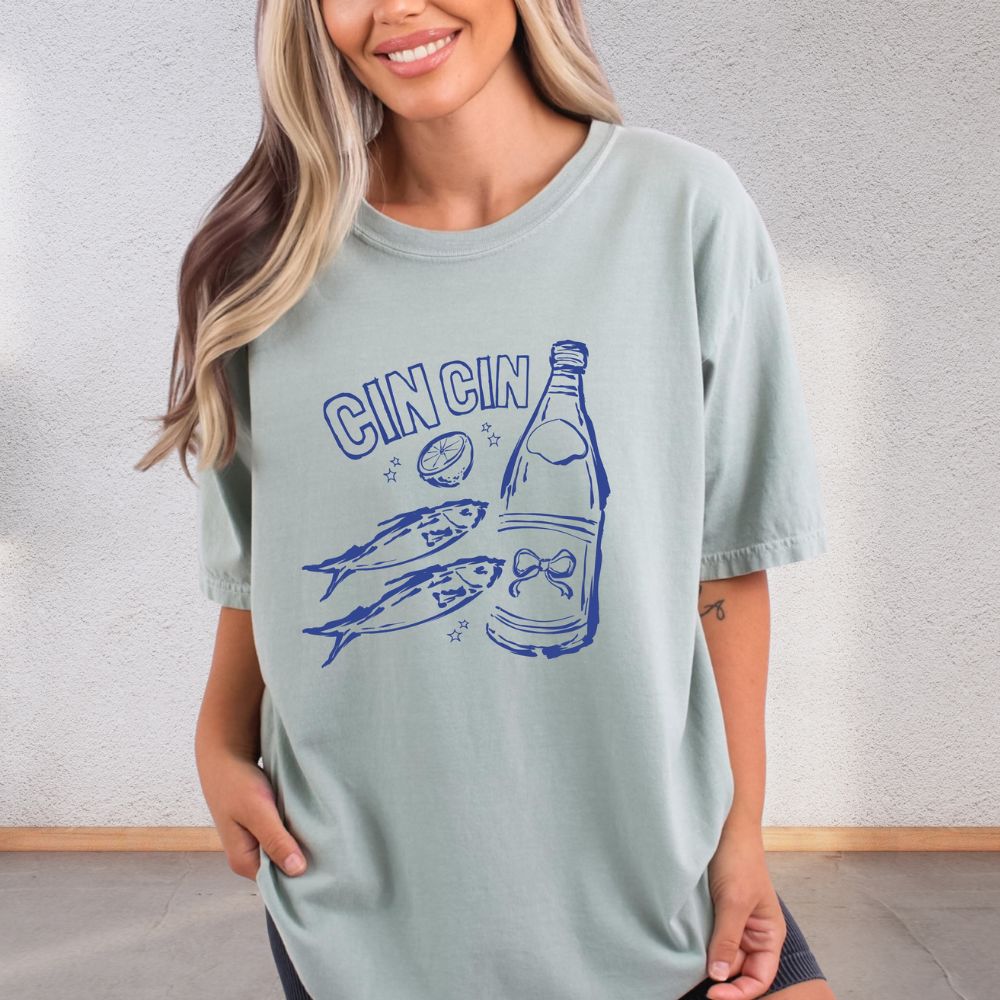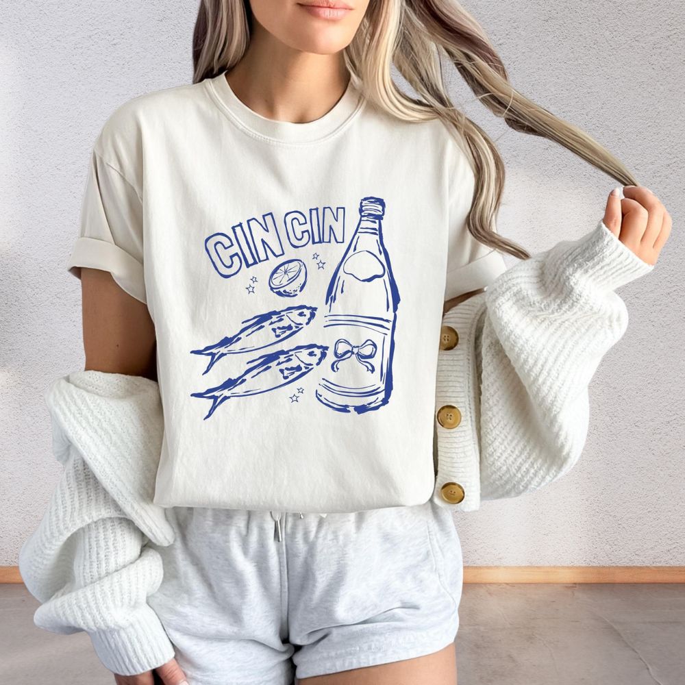 Add a splash of playful charm to your wardrobe with our Cin Cin Sardines Tee – where vintage Mediterranean vibes meet cool downtown girl energy. Featuring a quirky sardine can graphic and the phrase “Cin Cin” (Italian for “cheers!”), this shirt is a toast to effortless style.