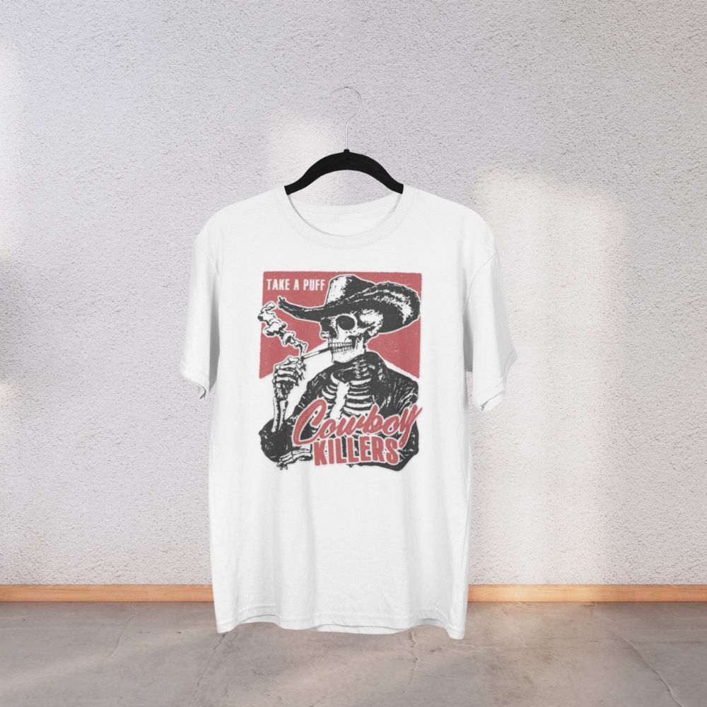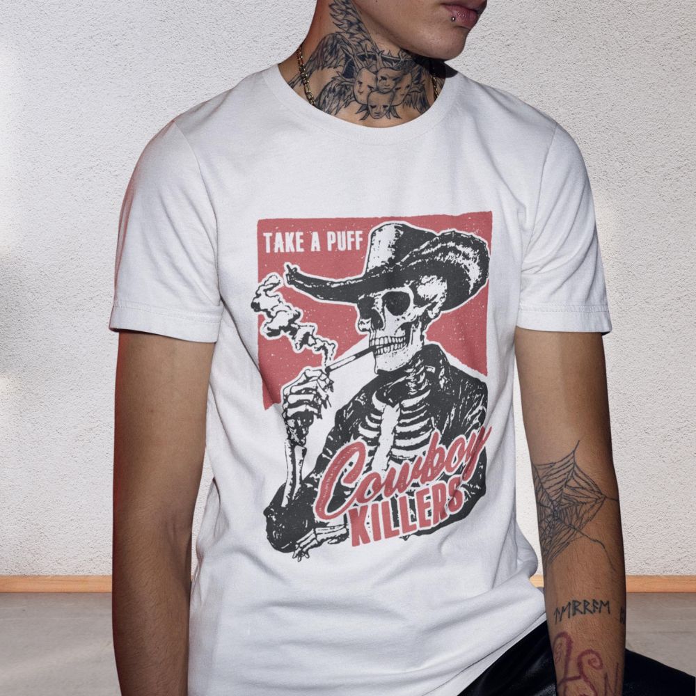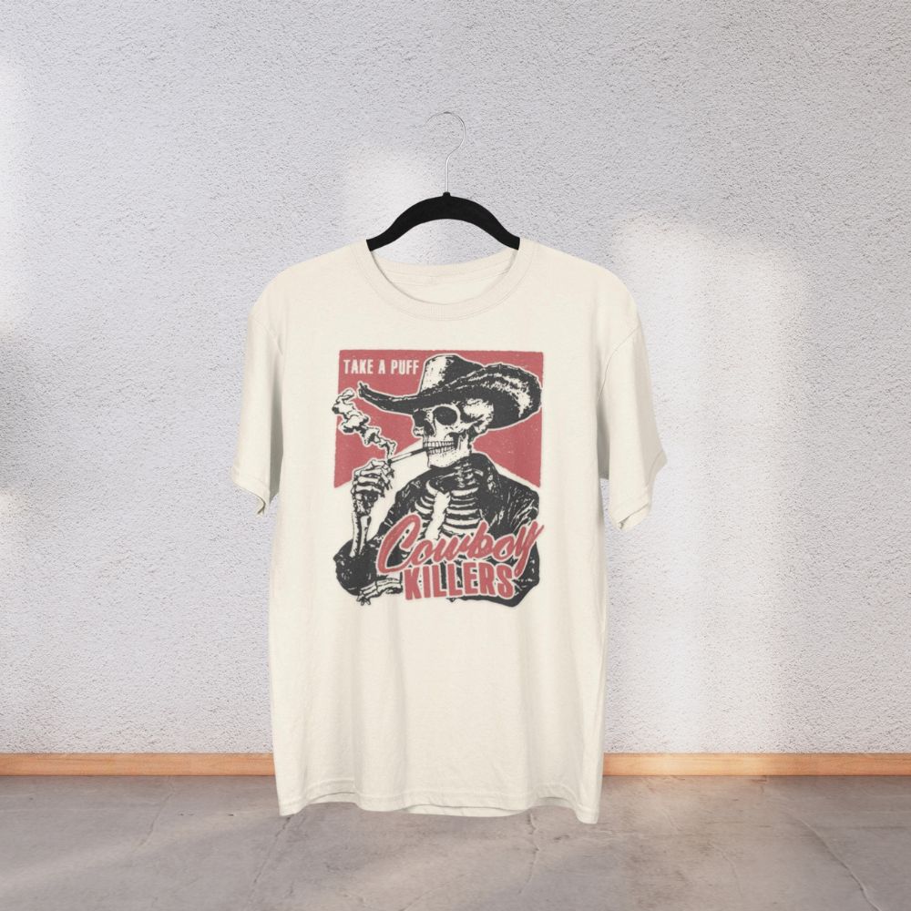 Saddle up for a ride through the wild side with the Vintage Skeleton Cowboy Killer Shirt – where gritty Western attitude meets gothic edge. This tee features a haunting skeleton cowboy, inspired by classic Marlboro man iconography, reimagined with rebellious flair.